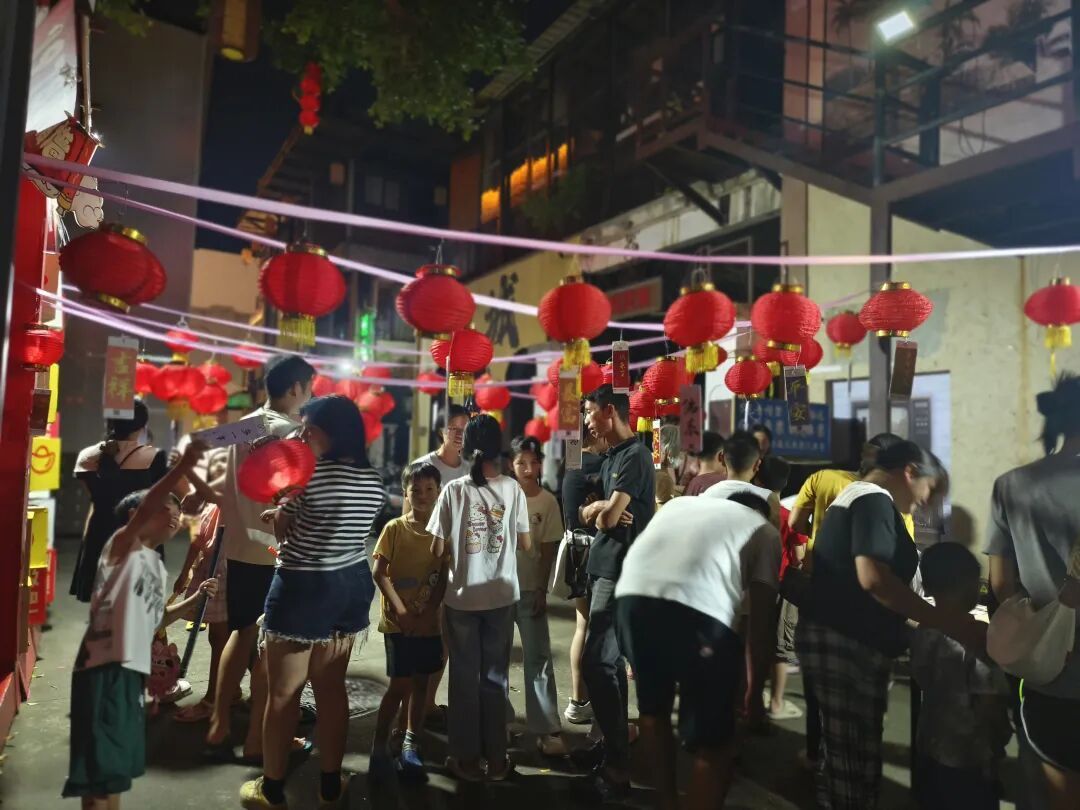 现场上百盏灯笼整齐悬挂,每盏灯笼下都系着一条彩色灯谜纸条,内容涵盖诗词、成语、本地人文、中秋典故等,既有童趣,也具文化深度。