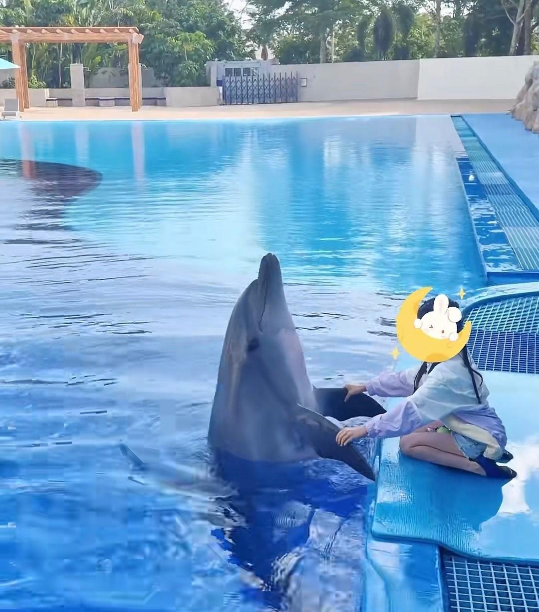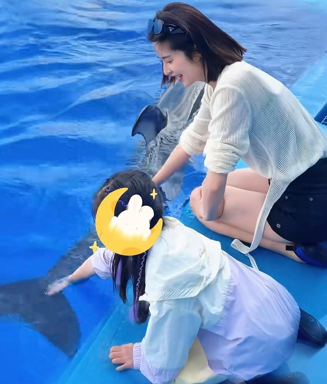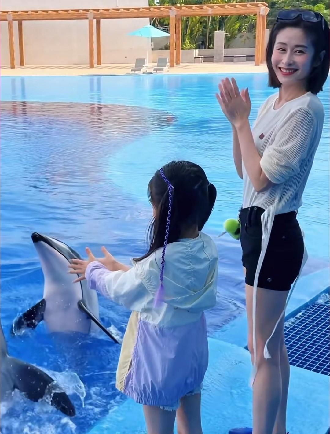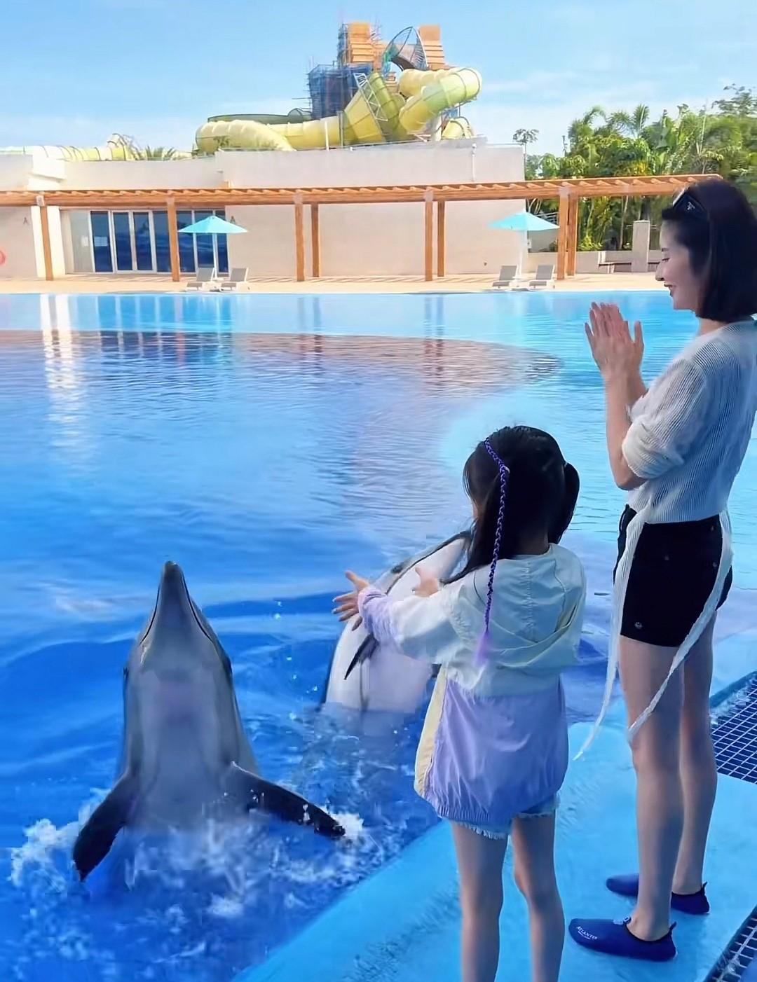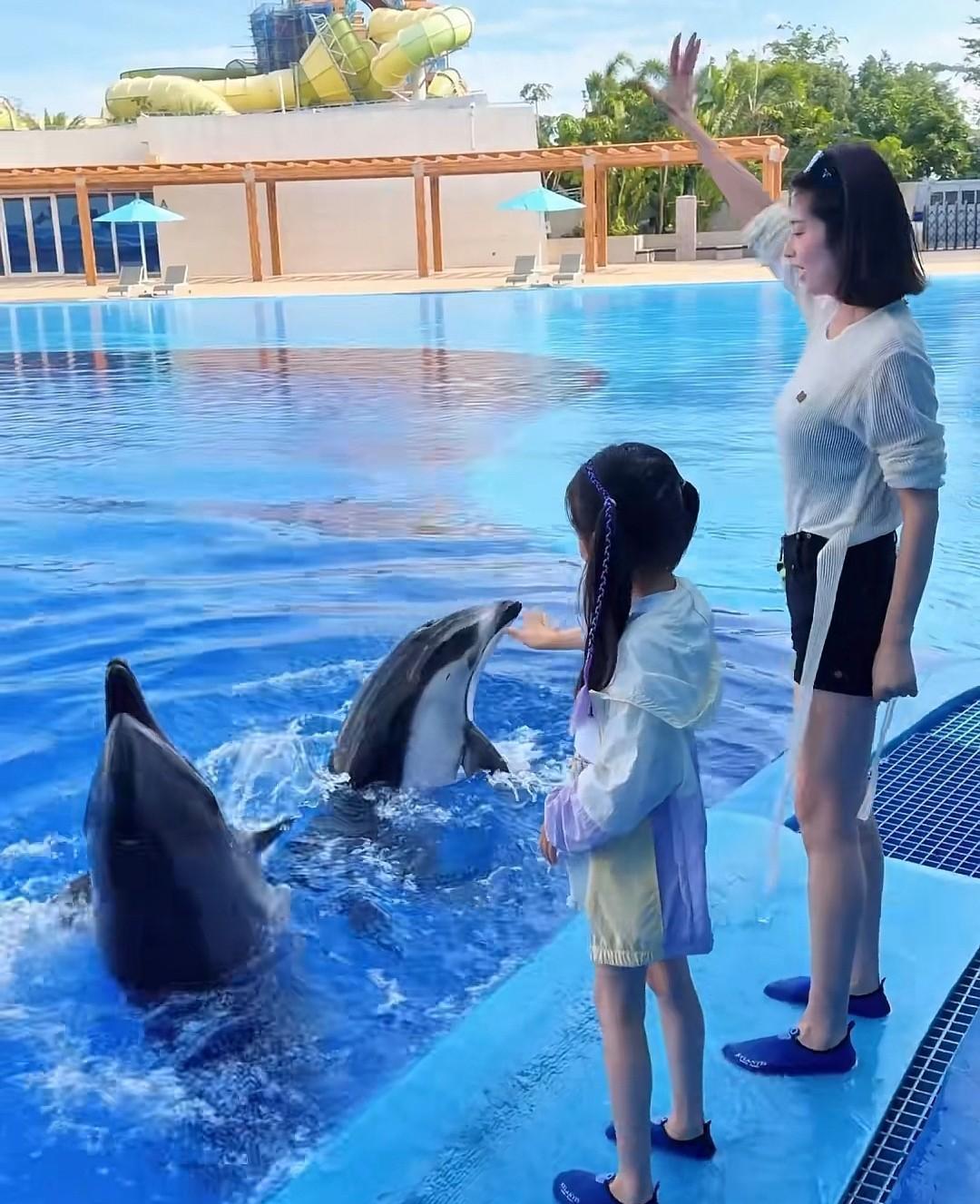 母女两个一块在岸边触摸海豚,颖儿每次带娃都是高质量陪伴,去的地方都不重样,小月亮跟着妈妈,拥有很多新奇的体验,童年过得非常快乐。