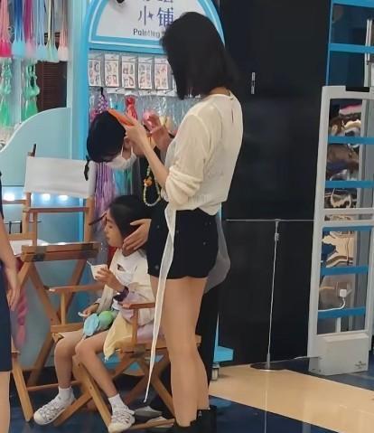 有粉丝在逛街的时候正好遇到了颖儿和她家女儿,小月亮坐在凳子上梳头发,侧脸和付辛博特别相似,颖儿则站一边等着,穿搭简单时尚,真人比电视里气质更好。