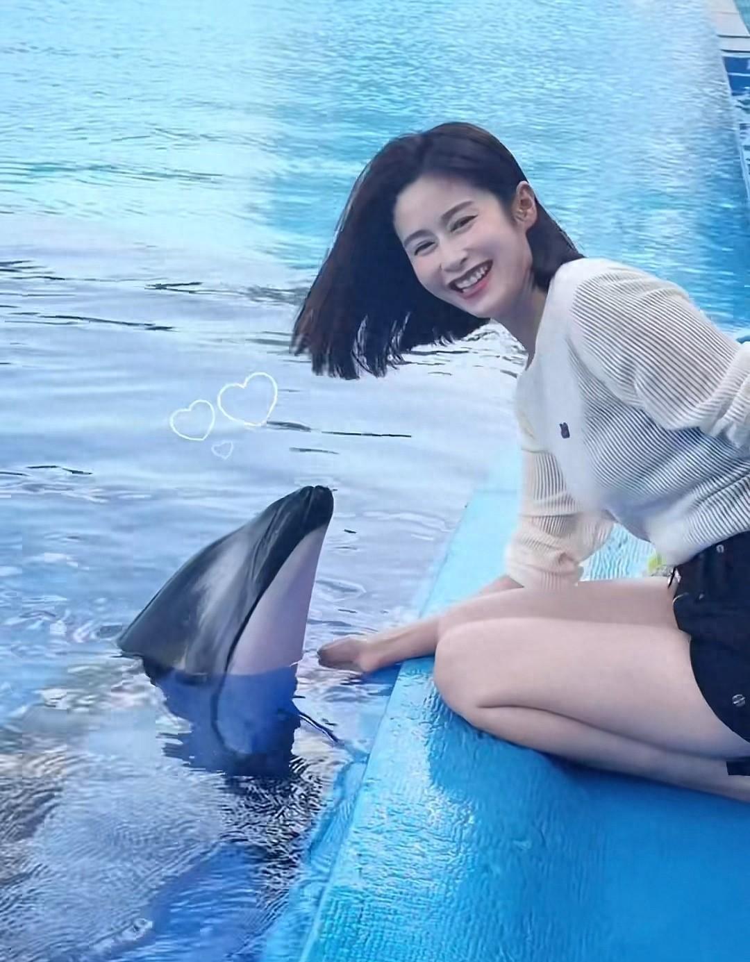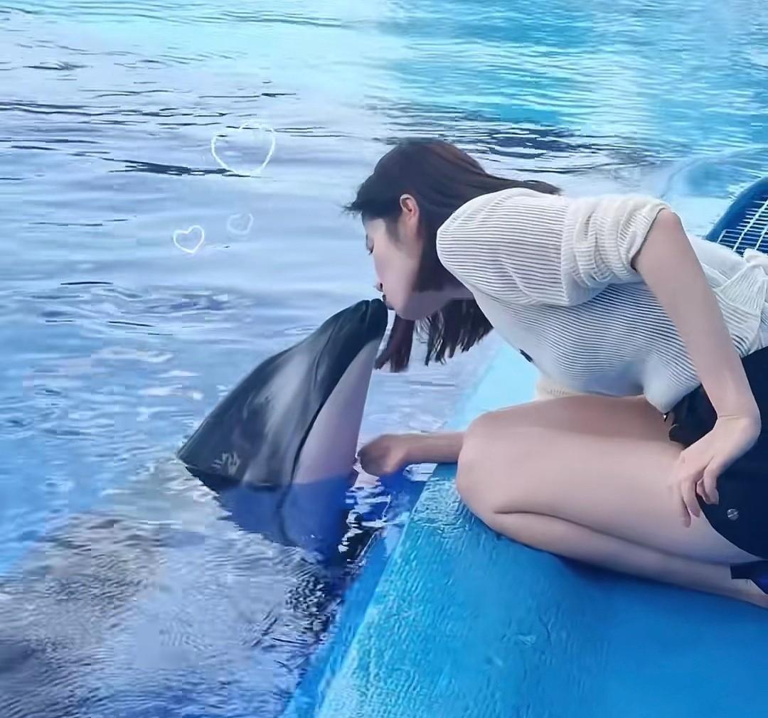 工作人员指导颖儿和海豚互动,她特别幸运和海豚来了一个非常浪漫的亲吻,这一幕特别有爱。