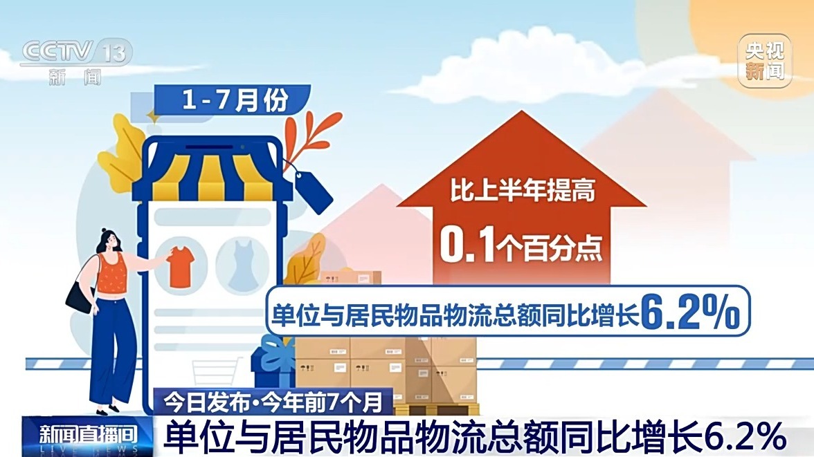 单位与居民物品物流需求稳健增长。1-7月份,单位与居民物品物流总额同比增长6.2%,比上半年提高0.1个百分点。“以旧换新”政策带动家用电器和音像器材类、通信器材类物流需求快速增长。