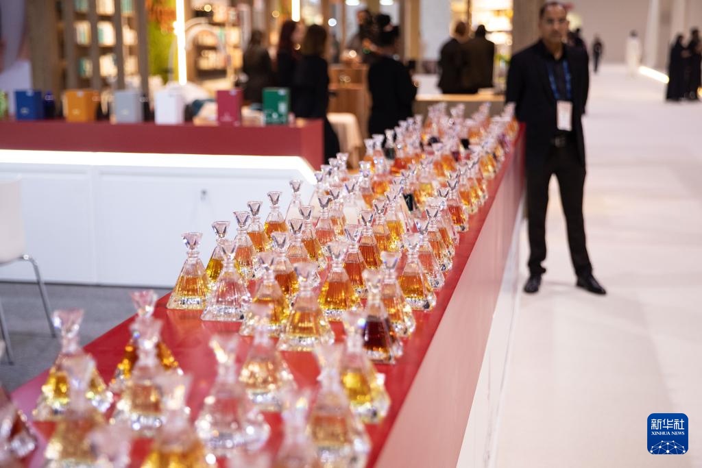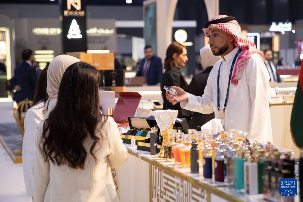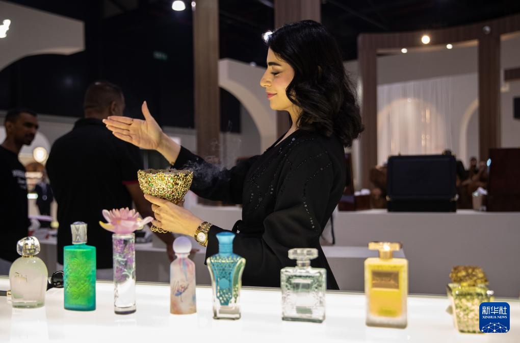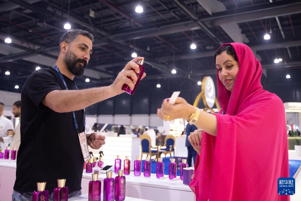 11月25日,在位于巴林首都麦纳麦的巴林世界展览中心,参展商在香水展上推介香水。新华社记者 陈君清 摄