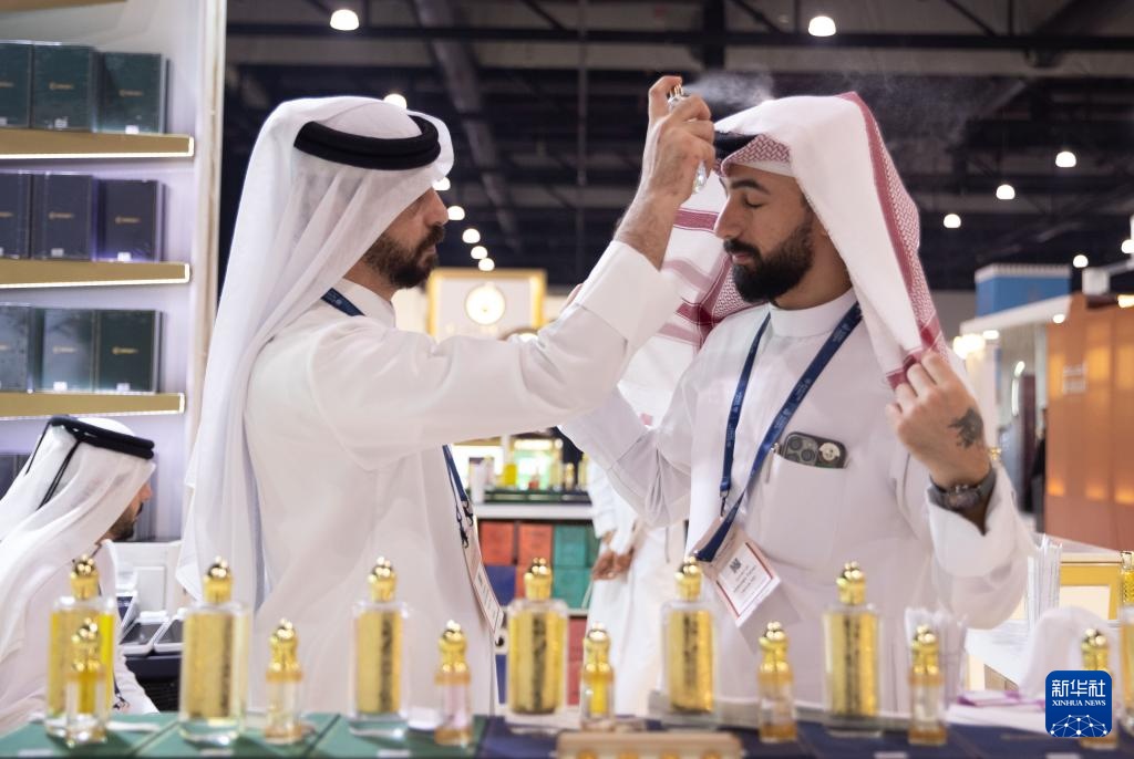 11月25日,在位于巴林首都麦纳麦的巴林世界展览中心,一名男子在香水展上为他人试喷香水。新华社记者 陈君清 摄