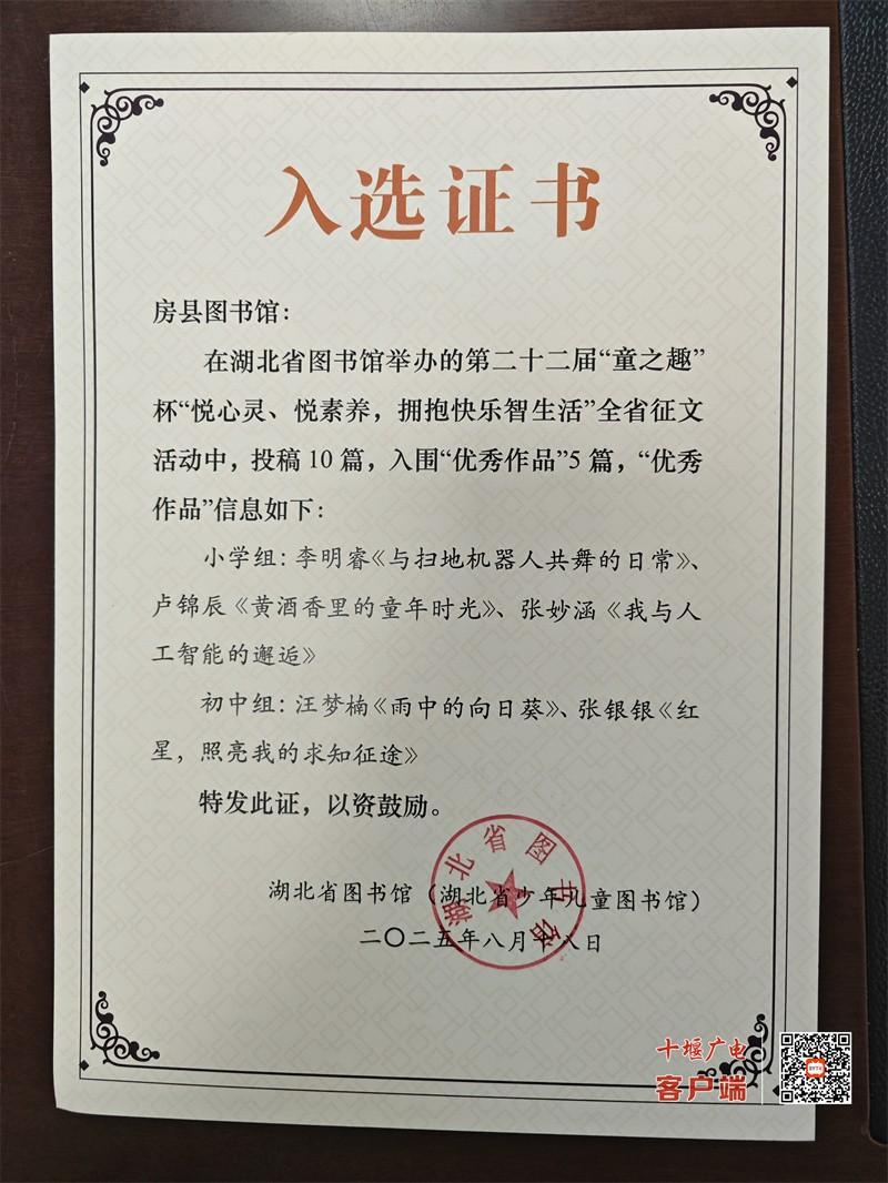 十堰广电讯(通讯员 王丽君)近日,由湖北省图书馆、湖北省少年儿童图书馆联合举办的第二十二届“童之趣”杯“悦心灵、悦素养,拥抱快乐智生活”全省征文活动圆满落幕。经房县图书馆精心组织和推荐,房县参赛作品在全省众多投稿中脱颖而出,取得了优异成绩!