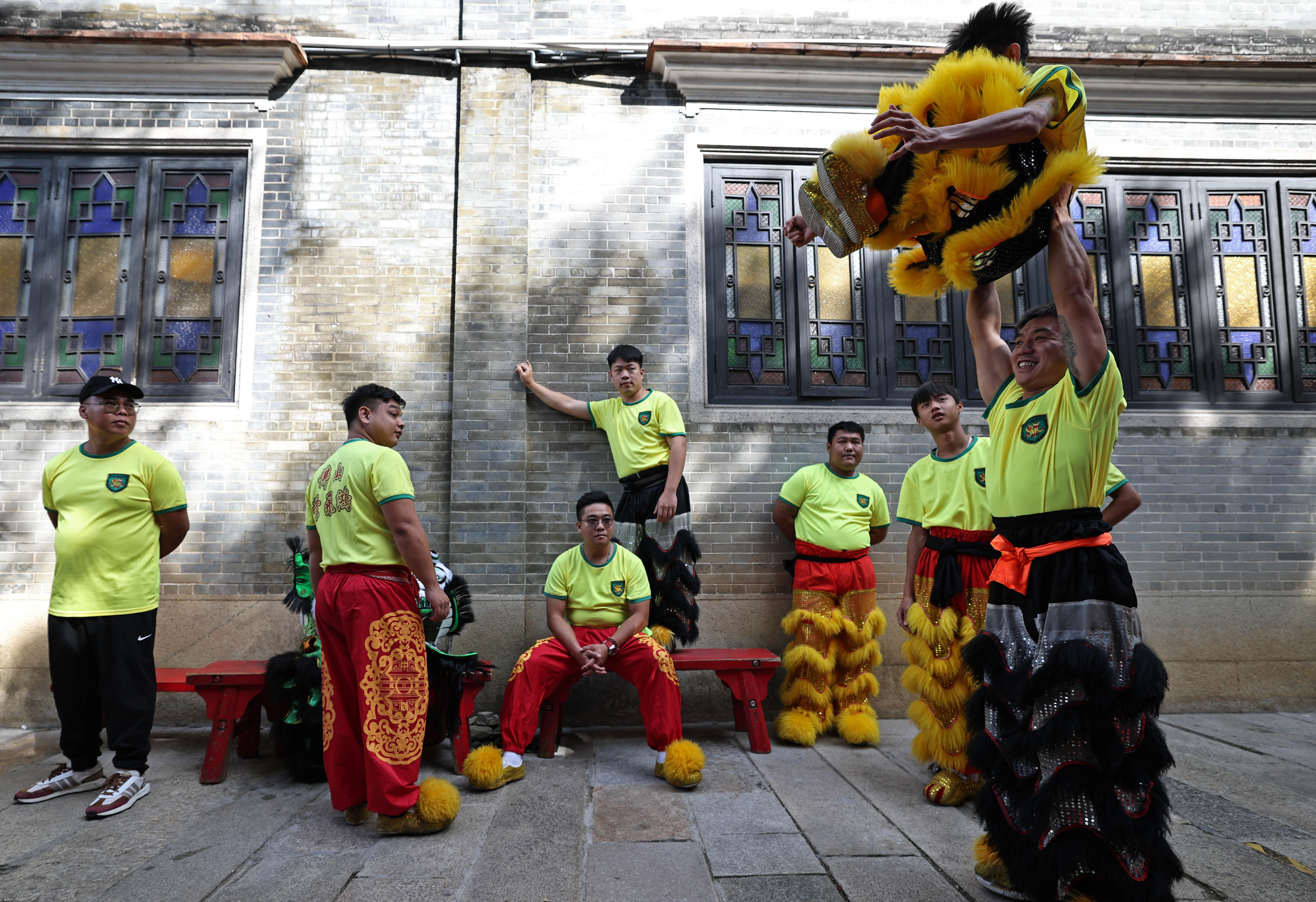 佛山黄飞鸿醒狮队在黄飞鸿纪念馆前表演。新华社记者 王鹏 摄